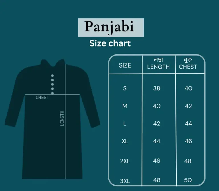 সাইজ সিলেক্ট করুন *৩৮ সাইজ=>লম্বাঃ ৩৮, বুকঃ ৪০ * *৪০ সাইজ=>লম্বাঃ ৪০, বুকঃ ৪২ * *৪২ সাইজ=>লম্বাঃ ৪২, বুকঃ ৪৪ * *৪৪ সাইজ=>লম্বাঃ ৪৪, বুকঃ ৪৬ * *৪৬ সাইজ=>লম্বাঃ ৪৬, বুকঃ ৪৮ * *৪৮ সাইজ=>লম্বাঃ ৪৮, বুকঃ ৫০ * *৫০ সাইজ=>লম্বাঃ ৫০, বুকঃ ৫২ * *